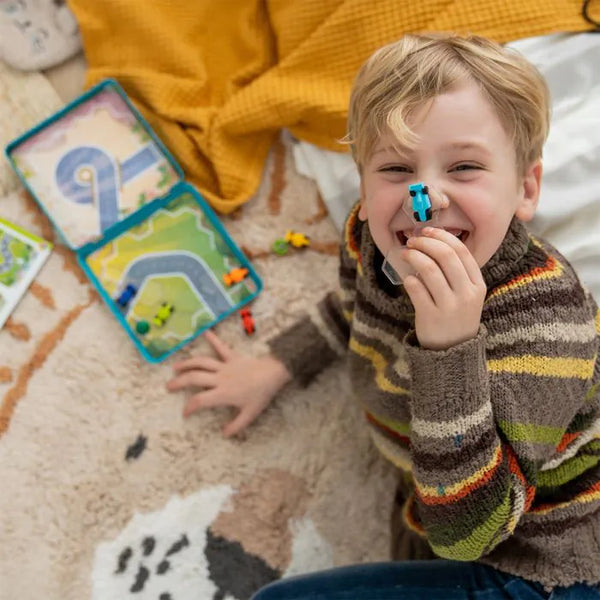 Prêt pour un tour de piste avec ce jeu de voyage en 3D ? Trouvez la position correcte des voitures de course aimantées pour savoir qui remportera le trophée ! « Pole Position » est un jeu de placement unique se jouant dans une boîte métallique idéale pour voyager. Remportez quarante-huit défis passionnants, en parcourant six circuits différents. Trois… Deux… Un… Partez !